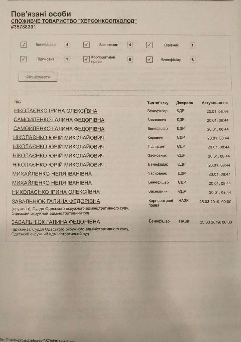 Однако и на должности судьи-спикера Игорь Завальнюк чувствует себе прекрасно. Такой вывод напрашивается даже с официальной декларации служителя Фемиды, который имеет в Одессе две квартиры, площадью по 104 кв.м. ездит на INFINITI QX56, стоимостью под миллион гривен. Да и на «черный день» у судьи официально отложены деньги как в гривне, так и в иностранной валюте. А все потому, что жена судьи – бизнесвумен Галина Федоровна – является бенефициарием «Херсонкоопхолод», а также работает в потребительском кооперативе «ЮНИАС».