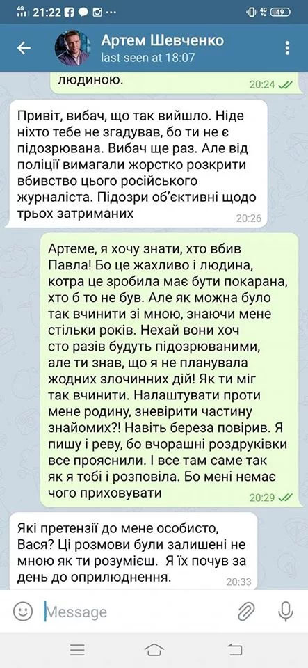 В субботу, 1 февраля, журналистка Василиса Мазурчук, которая знакома с одной из подозреваемых в причастности к убийству Павла Шеремета Юлией Кузьменко, опубликовала некую переписку с якобы спикером МВД Артемом Шевченко.