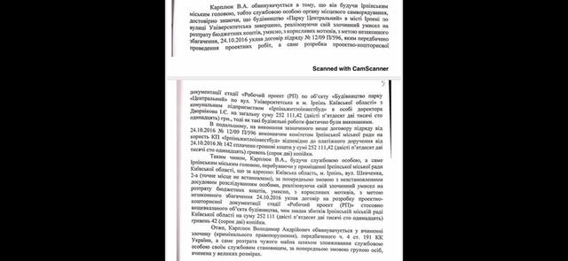 Бывший городской голова Ирпеня на Киевщине Владимир Карплюк получил обвинительный акт в рамках уголовного производства №42017111200000377 о присвоении и растрате в особо крупных размерах средств, предназначенных на проектирование парка “Центральный” в 2016 году. Фрагмент документа оказался в распоряжении редакции. Это означает, что досудебное расследование завершено и дело передается в суд. Теперь Карплюку официально угрожает до 8 лет лишения свободы (санкция ч. 4 ст. 191 Уголовного кодекса).