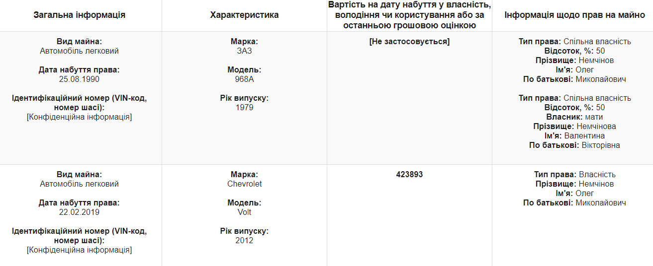 У декларації чиновника перед звільненням зазначено одинадцять об’єктів нерухомості. На самого секретаря оформлені: третина квартири у Львові (інші дві третини належать матері Немчінова, – ред.); ще одна квартира у Львові у повній власності чиновника на 51 “квадрат”; дві земельні ділянки у Львівській області; будинок, земельна ділянка та гараж у Львові та квартира у Києві. Дружина Немчінова володіє земельною ділянкою у Львівській області та квартирою у Львові. Мати чиновника окрім частки квартири у Львові також має земельну ділянку в області.