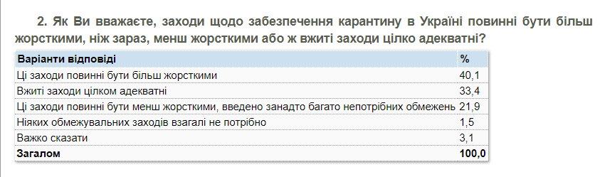 На вопрос, должны ли меры по обеспечению карантина в Украине быть более жесткими, чем сейчас, или же их вполне достаточно, 40% опрошенных ответили, что меры нужно ужесточить. 33% считают, что меры вполне адекватные, и 22% полагают, что введено слишком много ненужных ограничений. То есть, 55% против ужесточения мер.