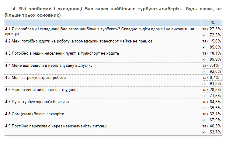 Из проблем и сложностей, которые больше всего беспокоят опрошенных, они в первую очередь указали проблемы здоровья близких (65%), затем - своего здоровья (32%) и неопределенность ситуации (46%), далее финансовые трудности (29%) и сложность находиться дома (28%) , отсутствие транспорта (15%). Угроза потерять работу (9%), и неоплачиваемый отпуск (7%) внизу списка, но опрос был проведен лишь спустя несколько недель по введении мер.