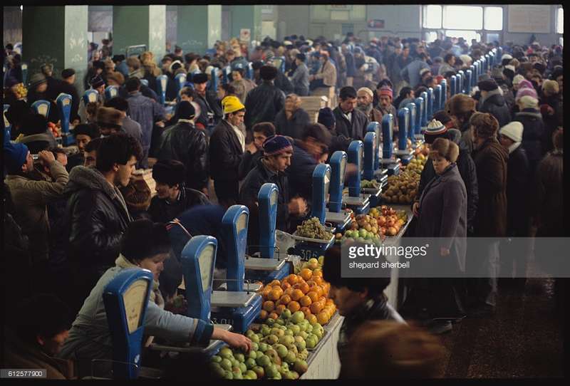 Вот еще хорошая фотография торговых рядов советских лет. При кажущемся изобилии на торговых рядах сам ассортимент очень бедный — фактически, продаются только яблоки (плохие), хурма, гранаты и виноград. Всё на вид достаточно плохонького качества, и, как я уже писал, продаётся по совсем "немагазинным" ценам — цены на рынке были в 3 раза выше.