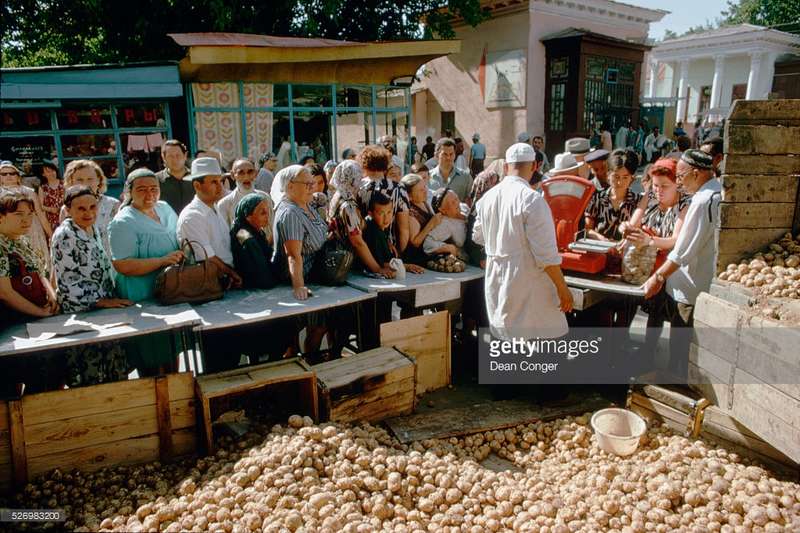 Более менее-свободно (по крайней мере, в тогдашней БССР) можно было купить картошку, и народ часто запасался ей в каких-то невероятых, промышленных масштабах, одновременно с этим изобретая десятки блюд из картофеля. Картошкой торговали в том числе и на улицах — уличная торговля картошкой выглядела примерно вот так, как на фото.