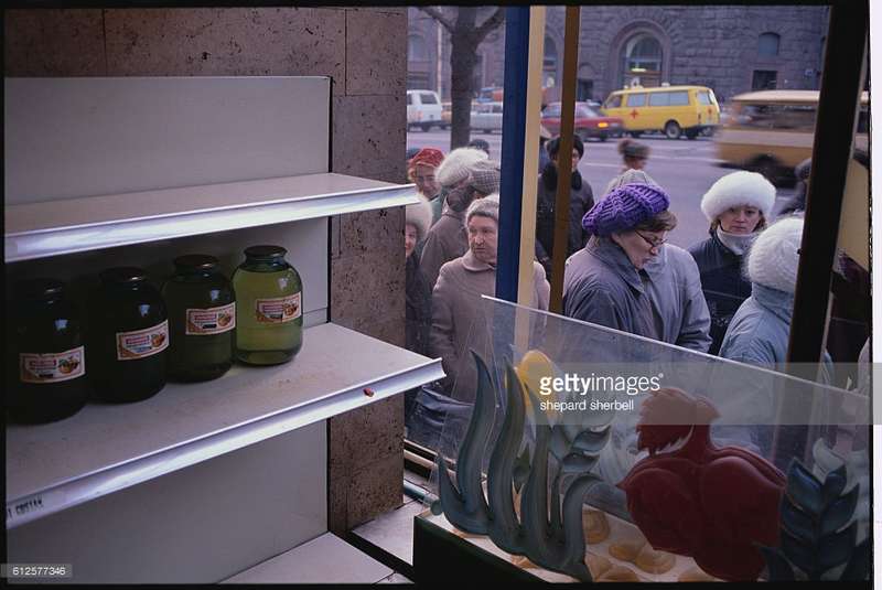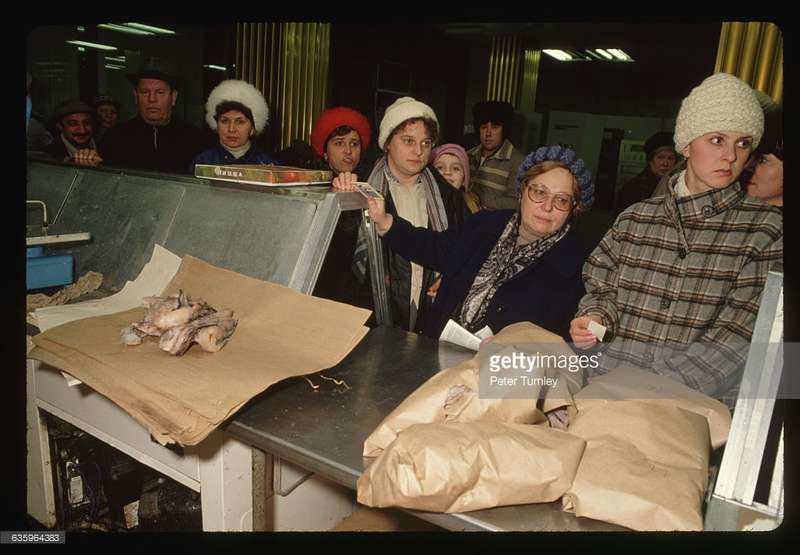 Примерно до конца 1970-х годов более-менее обстояли дела в СССР с рыбой, но потом и она пропала с прилавков. Вот очень хорошее фото — покупатели стоят в длинной очереди за какой-то рыбной требухой вроде "хвостов минтая", из которых можно было приготовить только уху, больше ничего. Время от времени мороженую рыбу могли продавать "мимо кассы" прямо с крыльца магазина, из пластиковых ящиков.