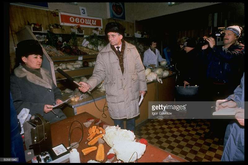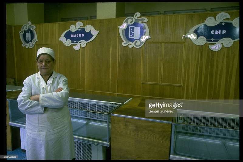 Снимок из той же серии. Здесь прямо-таки читается сюжет — парень просит продавщицу дать ему кусочек получше и указывает на него пальцем, а она суёт ему кусок какого-то мосла с текстом вроде "Мущиинаааа! Берите, а то и этого не будет!". Вот это всё и есть то самое "натуральное советское мясо". Хотите такое попробовать?