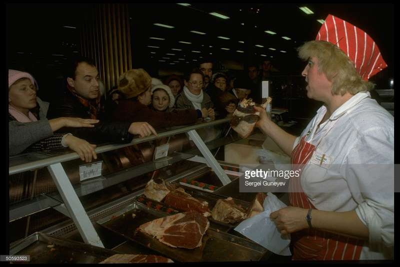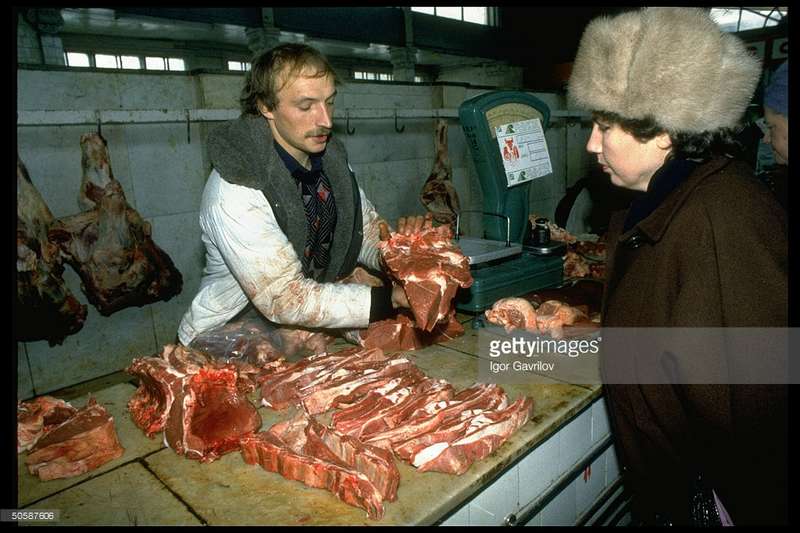 Начнём, пожалуй, с мяса. Нормального мяса в СССР практически не существовало, вспомните "классические" блюда советской кухни — всякие там котлеты и прочее такое. В отличие от например стейка, котлеты можно приготовить из всякой мясной требухи, перетертой через мясорубку, да ещё и разбавить эту требуху хлебом. В позднем СССР даже такое плохонькое "котлетное" мясо было большим дефицитом, и за ним выстраивались немалые очереди.