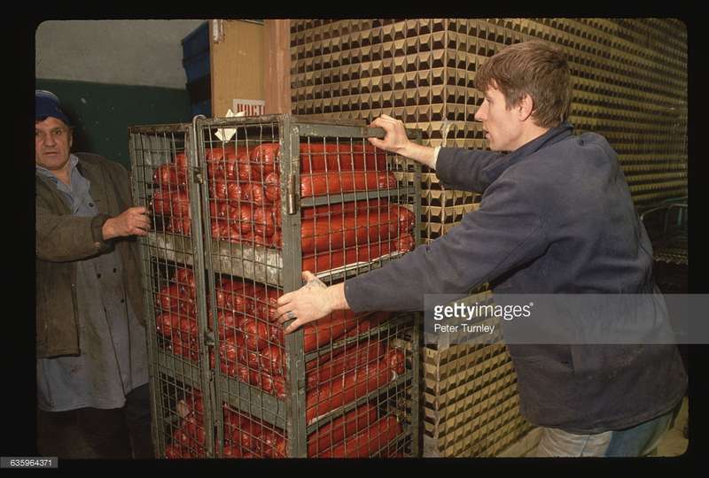 Более-менее приличная колбаса (с большим содержанием мяса и малым содержанием бумаги) была дефицитом. Вот очень хороший снимок, передающий атмосферу тех лет — грузчики тянут в торговый сетчатый контейнер, полный палок "хорошей" колбасы — такой контейнер разметался примерно минут за 15, причём часто существовало ограничение — отпускать не более 1-й палки колбасы в руки, именно поэтому в на фото советских очередей можно увидеть так много детей — их брали в поход за дефицитом в качестве "вторых рук".