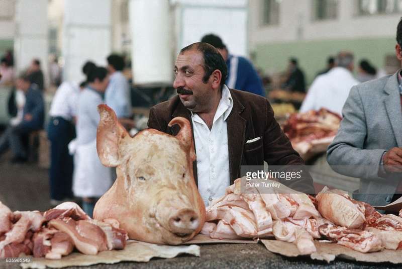 Чуть лучше дела с мясом обстояли на рынках — рынки существовали практически в каждом городе СССР, и на них иногда можно было купить то, чего не было в магазинах. Существовал, скажем, неплохой выбор свинины, но и тут были свои нюансы — хорошие куски туши либо разбирались очень быстро, либо продавались "из-под прилавка" "своим" покупателям. В общем, чтобы купить хорошей свинины, нужно было хорошо подсуетиться, без проблем можно было достать только примерно то, что на фото ниже — сало, субпродукты, всякие обрезки и т.д.