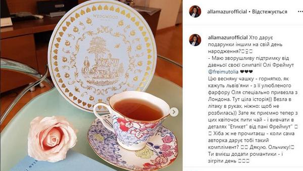 Ранее коллегу поддержала и Оля Фреймут. Она специально для Аллы привезла из Лондона оригинальную фарфоровую чашку с цветочным рисунком, а также преподнесла свою книгу. В подписи Оля назвала Мазур «самой совершенной девочкой в мире». Телеведущая показала подарок в Inatagram и тепло поблагодарила Фреймут в посте.