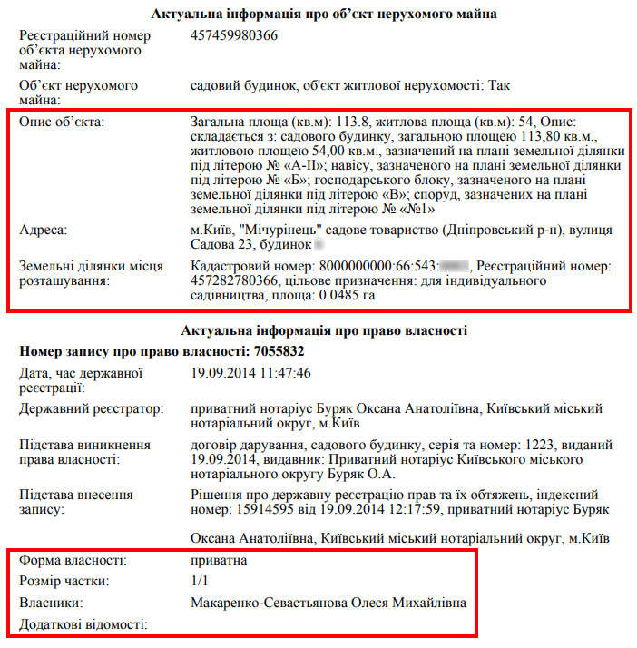 До того як суддя розійшлася зі своїм чоловіком Михайлом Макаренком, вони мали ще один спільний будинок на тій же вулиці. Після поділу майна, будинок перейшов чоловіку, який у 2014 році подарував його дочці — Олесі Макаренко-Севастьяновій.