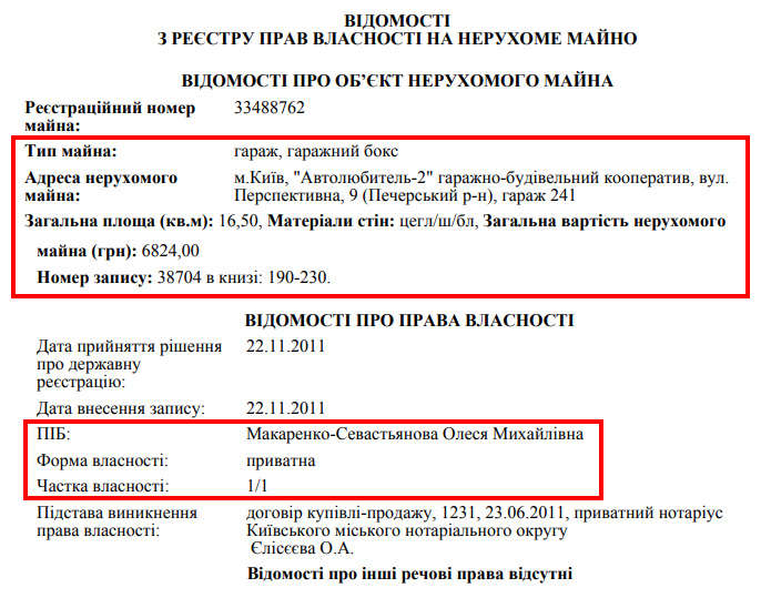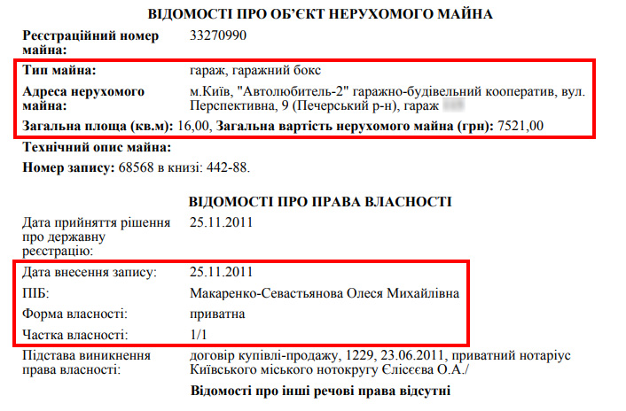 Серед нерухомості Олесі ми знайшли два гаражні бокси в Печерському районі Києва, придбані у 2011 році. Водночас автомобілем вона керує лише одним. Принаймні така інформація міститься у відкритому реєстр Міністерства внутрішніх справ, куди не додаються автомобілі, зареєстровані до 2013-го.