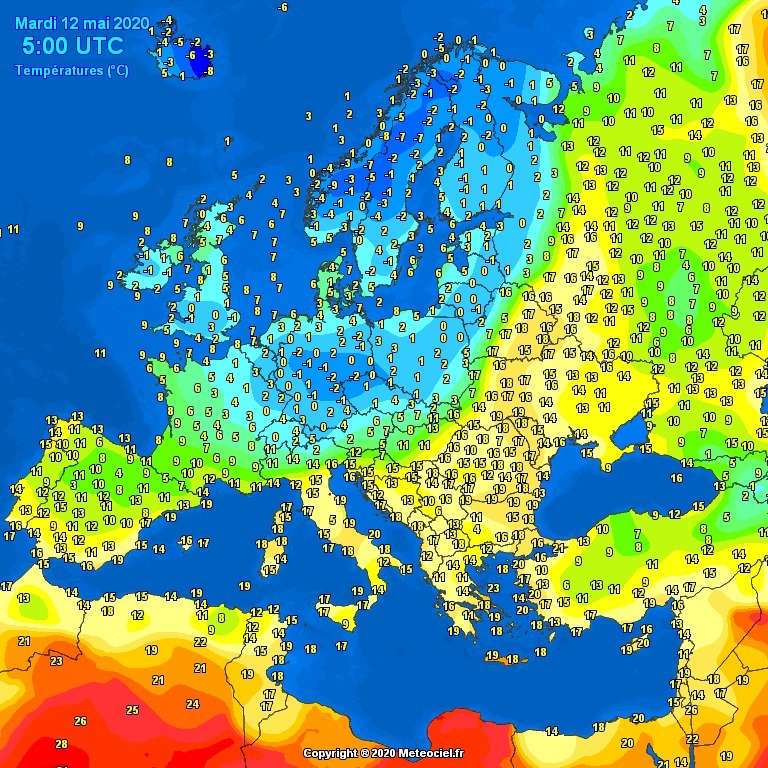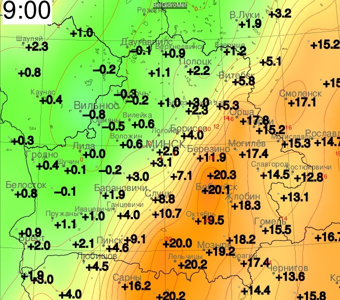 "На последних двух картах фактическая температура воздуха на утро в Европе и отдельно контрасты по Республике Беларусь", – добавил метеоролог.