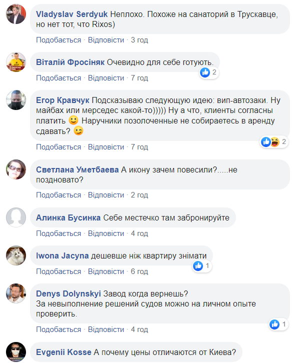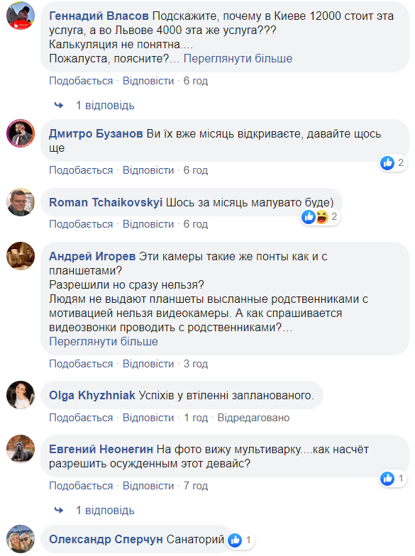"Отличное предложение. Надо учитывать, что в стоимость входят надежная охрана, трехразовое питание, стабильный коллектив, бесплатная библиотека, прогулки, культурная программа", "Вот тут уже в разы лучше сделано, чем в Киевском СИЗО и цены даже ниже", "А чего во Львове дешевле чем в Киеве? Лукьяновка более популярна", "Подскажите, почему в Киеве 12 000 стоит эта услуга, а во Львове 4000? Калькуляция не понятна", "Если эти деньги пойдут на ремонт и благоустройства СИЗО, почему бы и нет", "Санаторий", – комментируют подписчики.