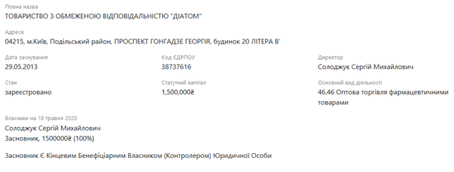 ООО «Диатом» из Киева, оформленное на жителя Коломыи Сергея Солоджука, но в реальности входящее в бизнес-группу бизнесмена Петра Багрия.