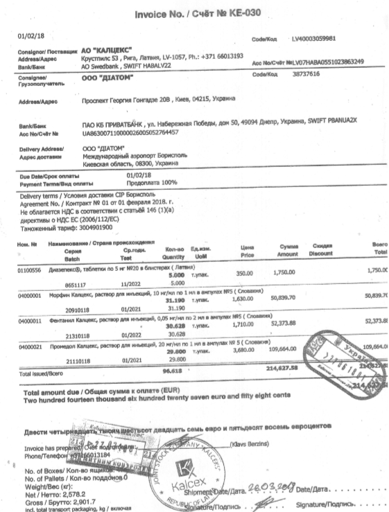 Но вернемся в Украину. В апреле 2018 года компания Багрия «Диатом» завезла препараты компании «Калцекс» (Морфин Калцекс, Промедол Калцекс, Фентанил Калцекс и Диазепекс) в нашу страну на сумму 6,8 млн. грн., но не смогла их растаможить по причине судебных разбирательств.