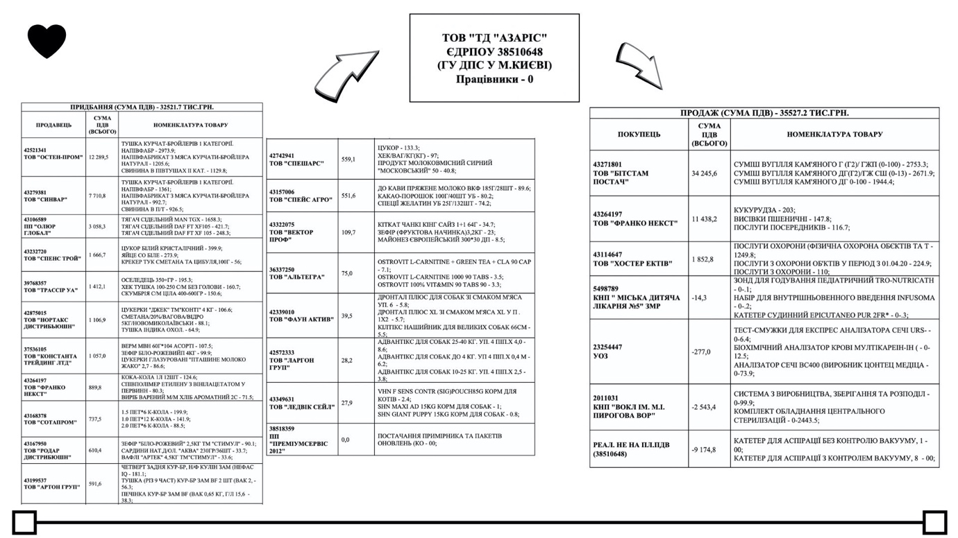 Стоит отметить, что, согласно данным аналитической платформы YouControl, ООО "ТД "АЗАРИС" имеет налоговый долг больше 420 тыс. грн. Конечным бенефициаром компании является Евгений Сергеевич Гасюков, зарегистрированный на временно оккупированной территории Украины, а именно в г. Хрустальный Луганской области. В то же время, директором ООО "ТД "АЗАРИС" является Счастливенко Павел Александрович. Интересно, что последний является также директором или собственником 69 компаний. Вероятно, все упомянутые выше лица являются подставными.