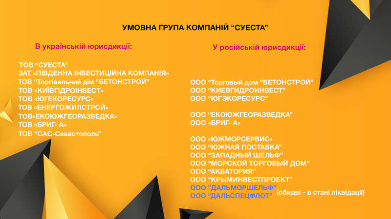 Група компаній «Суеста» — умовна. Тобто, такої юридичної особи не існує, але є ТОВ «Суеста», зареєстроване в поки що окупованому Донецьку. Без пов’язаних з ними неприбуткових організацій (що також були засновниками цілої низки підприємств), до ГК «Суеста» можна занести близько десятка українських компаній. Більшість із них мають двійників у російській юрисдикції, тобто, після окупації Криму були зареєстровані ще й у державному реєстрі РФ. Окрім двох: ЗАТ «Південна інвестиційна компанія» та ТОВ «Суеста» (яка, втім, є засновницею «російського» ООО «Южная гавань»).