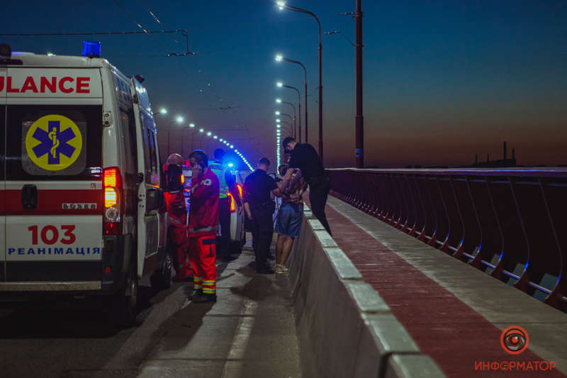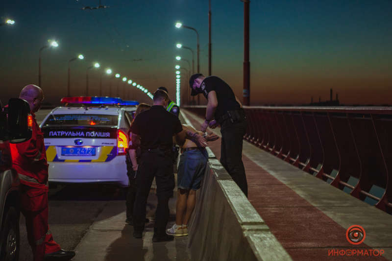 В ночь с 7 на 8 июня молодой парень пытался спрыгнуть с Нового моста в Днепре. Он уже перелез за перила и практически отпустил их, как его схватили патрульные и затащили обратно.