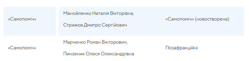 Так, наприклад, 17 депутатів з фракції «Самопоміч» створили депутатську групу «Київська команда», двоє увійшли до новоствореної фракції «Самопоміч» інші ж вирішили стати позафракційними. В таблиці нижче можна детальніше ознайомитись із тим, як мігрували депутати по фракціях.