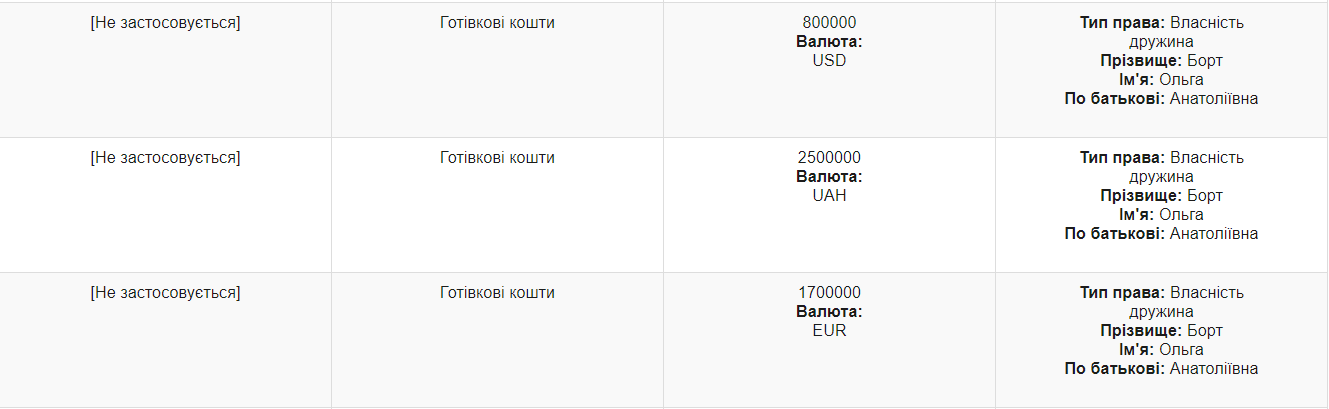 Дружина Борта Ольга задекларувала 800 тисяч доларів, 2 мільйони 500 тисяч гривень, 1 мільйон 700 тисяч євро або 75 мільйонів гривень.