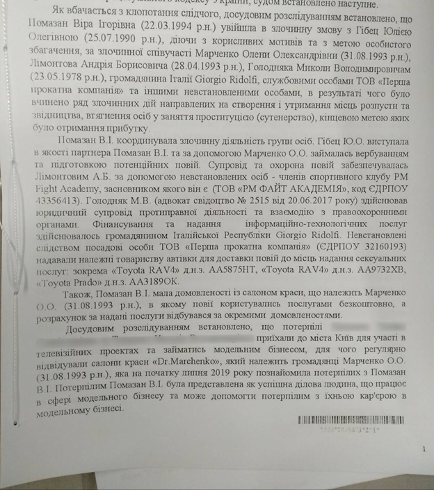 Согласно с ним, сообщником фигурантки выступил адвокат Николай Голодняк, осуществлявший юридическую поддержку «заведения».