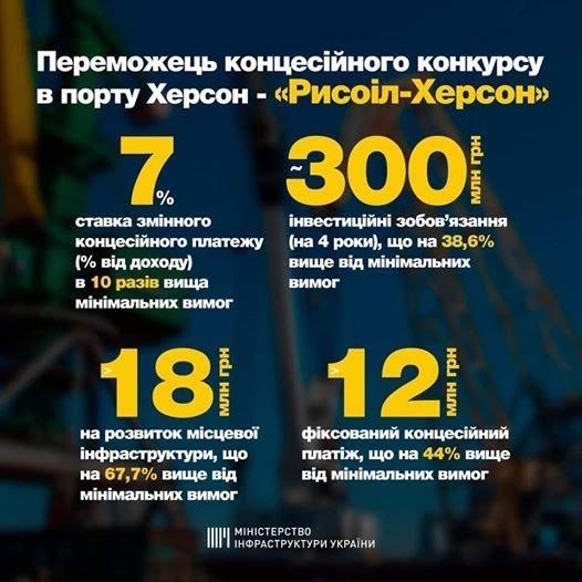 P.S. Херсонский порт перегрузил за 2019 год 3,8 млн тонн грузов (почти на 25% больше, чем 2018-м). Любой нормальный стивидор-владелец причала оставит себе не менее 2 долл. чистой прибыли с каждой перегруженной тонны. или более 6 млн. долл чистого заработка на развитие, инвестиции и т.д.. Или более 150 млн. грн. в год, более 10 млн. грн. в месяц … Недостаточно для развития, для инвестиций? А вот за что чиновники Украины сдали порт в концессию: гарантированно 1 млн. грн. в месяц, обещания в 300 млн. грн. на десятки лет.