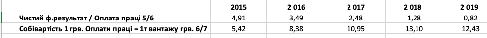 Есть еще несколько показателей, которые пришлось вспомнить из институтского курса “коммерческой работы транспорта”. Курса, который не проходили все последние министры инфраструктуры, а попутно "большие специалисты” по концессиям. Для этого следующая таблица из цифр предыдущей. В таблице выше производительность в разных формах от Администрации портов. А именно, в верхней - соотношение чистого финансового результата, т.е. прибыли к зарплате в самой Администрации по годам. Расшифрую: одна гривна зарплаты в Администрации приносила госпредприятию 4,91 грн. прибыли в 2015 году, а эта же гривна зарплаты в 2019 году принесла только 82 копейки прибыли государству… Анти-производительность работы госпредприятия очевидна только по этому показателю!