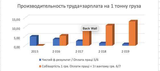 В нижней строке соотношение затрат на зарплату Администрации уже к обработанным в портах тоннам. Если 1 тонна в 2015 году “стоила” госпредприятию 5,42 грн. зарплаты, то в 2019 году уже 12,43 грн. на ту же самую одну тонну. И соответствующая тенденция на падение производительности труда более, чем очевидная!