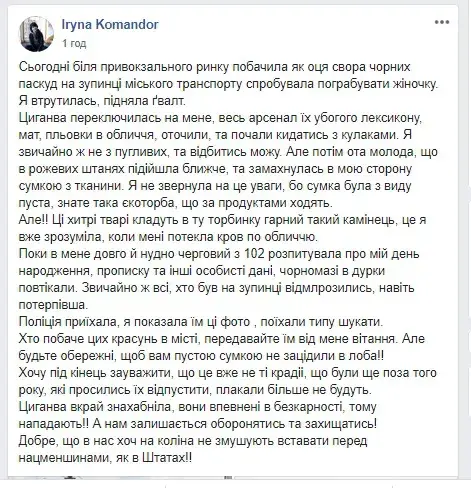 Ирина пишет, что стала свидетелем того, как ромы пытались ограбить женщину на остановке общественного транспорта и вмешалась. Цыгане окружили Ирину и начали плеваться в нее, нецензурно бранить и кидаться с кулаками.