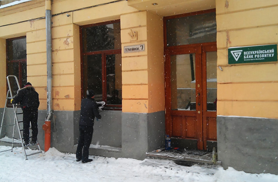 | Працівники ВБР відчищають фасад банку, який невідомі закидали яйцями, січень 2014 року. Фото hromadske.tv |