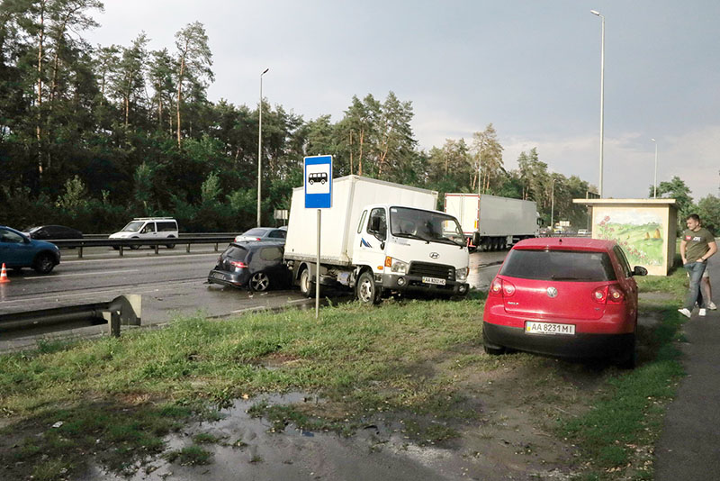 Во вторник, 11 августа, на Брест-Литовском проспекте при въезде в Киев произошло столкновение двух грузовиков МАN, фургона Hyundai и легкового Volkswagen Golf. Все они двигались в сторону Окружной.