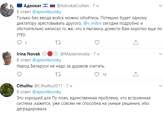 «Я б на месте Путина ввел бы войска, арестовал Лукашенко, посадил бы на трон Тихановскую, получив симпатии всей страны, и уже с ней, в политике еще большим нулем, чем Зеленский, окруженной всеми пророссийскими силовиками и министрами, которых оставил бы на своих местах, пользуясь пока еще отсутствием антироссийских настроений, подписал бы новые соглашения, по которым Беларусь переходит в полное и безраздельное владение России на веки вечные отныне и до скончания веков», — пишет Бабченко.