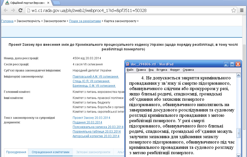 Позитивним зрушенням є те, що 20 березня 2014 року народні депутати України А. Павловський, Ю. Стець та О. Бригинець зареєстрували законопроект № 4504 про внесення змін до Кримінального процесуального кодексу України щодо порядку реабілітації, в тому числі реабілітації померлого.
