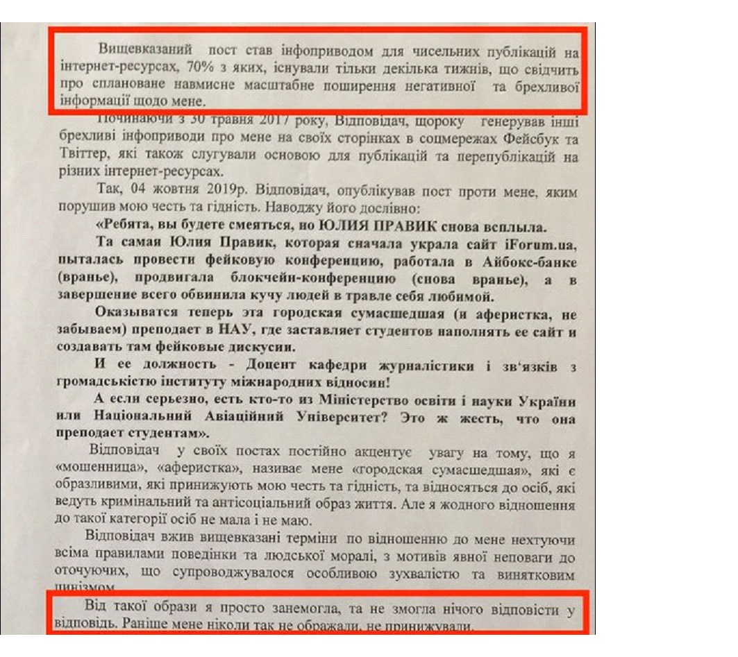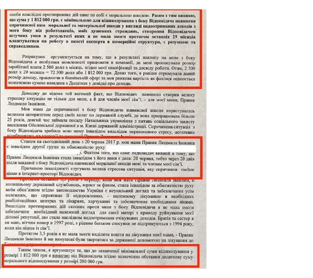 Итак, что мы видим по факту? У Юлии Правик мания преследования. которая длится уже на протяжении 3,5 лет на момент обращения в суд и она требует компенсации минимум 1 812 000 и еще морального ущерба 200 000 грн.