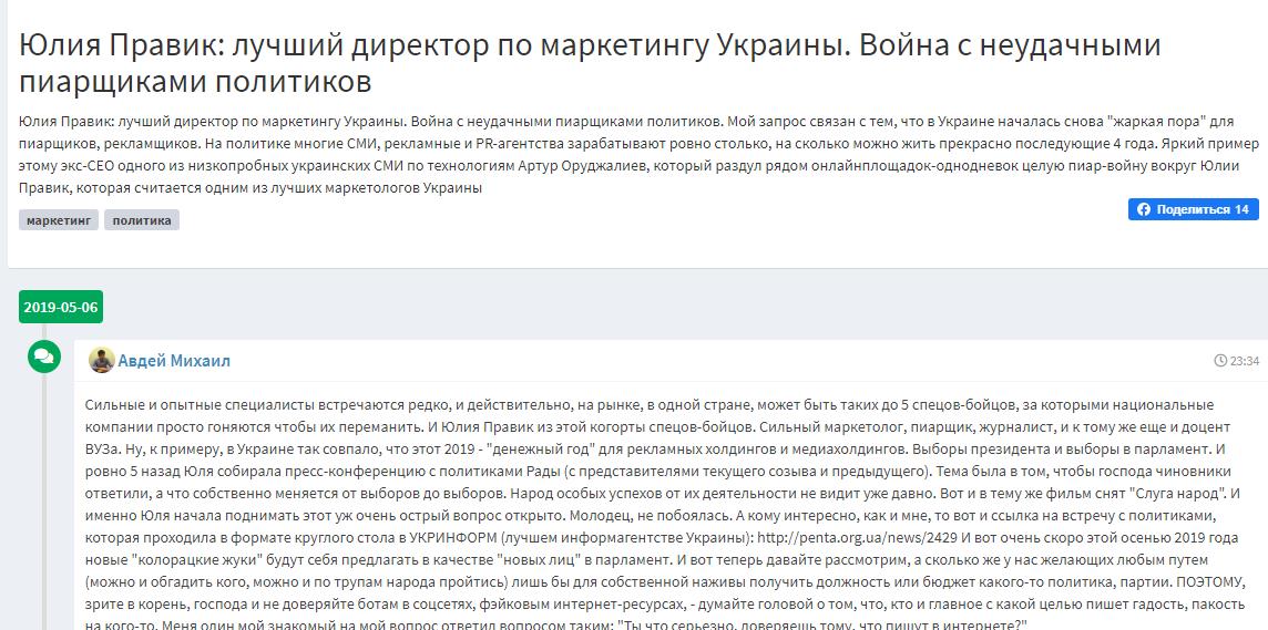 Кстати, об ОДАх и восхвалении… Такого позитивного говнеца на самом деле много и это не столько, смешно, сколько грустно! К слову, такая «подработка для студентов» актуальна далеко не на одном сайте. Видать, Юлия Правик поставила такую бесплатную, а, может, и нет, «схему» на постоянную основу. Все однотипно: ну и правильно, «по-студенчески»… Как говорится, ничего личного, но очень смешно, когда на каком-то нечитабельном сайте размещена целая палитра хвалебных отзывов о каком-то тупо неизвестном человеке, при том один лишь сплошной позитив, такой красиво расписанный длинно-слащаво. Ох, стыд и срам нашего общества. И как с этим бороться в эпоху тоталитарной виртуализации общества??? Лично я, не знаю путей.. И это бесит!!!