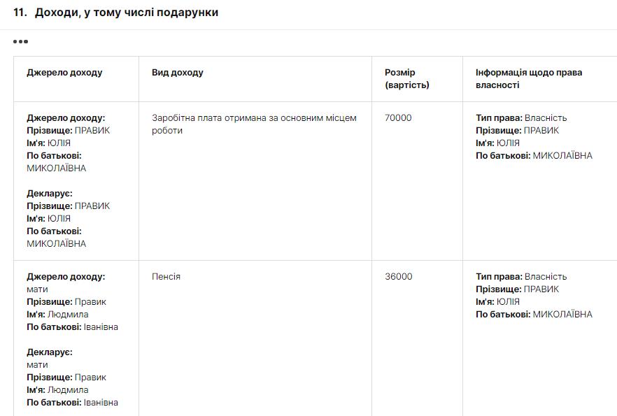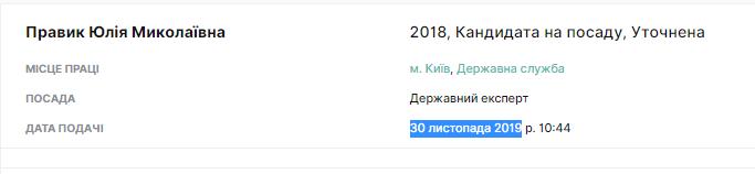 Итак, что собой представляет эта Ю. Правик? Согласно последней доступной декларации, заполненной Юлией в конце 2019-м, как кандидата на должность государственного эксперта в Госслужбе Украины, она весьма и весьма скромная личность.
