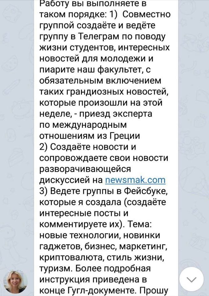 4. Далее Юлька засветилась в числе преподавательского состава Национального авиационного универа, где она выступала в качестве учителя СММ. Вроде бы ничего криминального, но вот родственники студентов жаловались, что дамочка заставляла своих студентов писать статьи на личный сайт NewsMaker, сопровождать ее группы и страницы в социальных сетях, создавать новые телеграм-каналы, а также – продвигать их.
