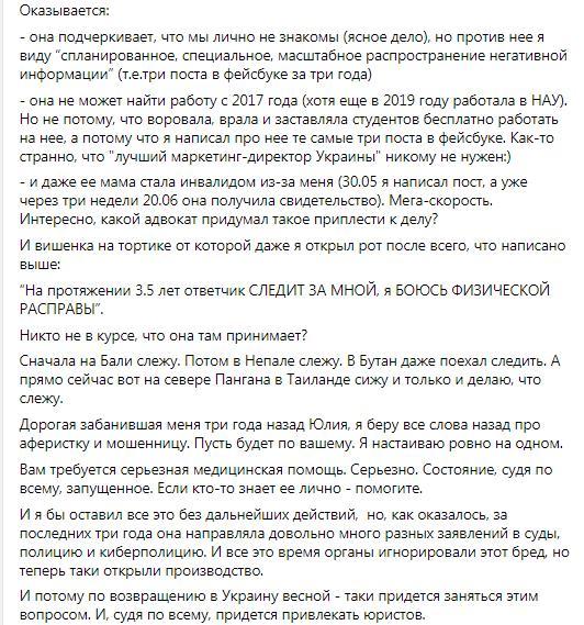 Свою публикацию он начал со слов «Сижу себе обедаю в Таиланде, никого не трогаю, как узнаю, что в Киеве ЮЛИЯ ПРАВИК ПОДАЛА НА МЕНЯ В СУД и хочет получить моральную компенсацию в размере, простите, 2 000 000 грн. Помните Юлию Правик?» и далее красноречиво разместил целую подборку ссылок на аферы и мошеннические сферы Юленьки… Ой, как неудобно получилось.