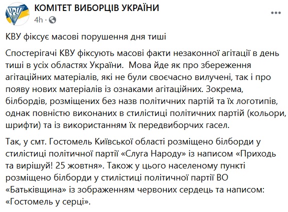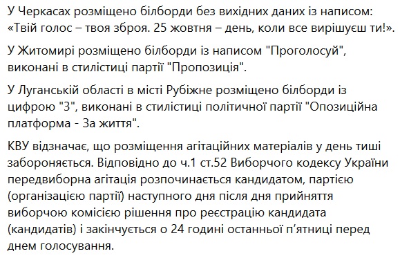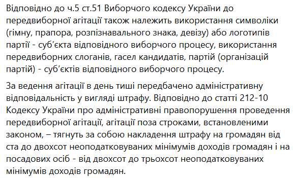 В КИУ отметили, что размещение агитационных материалов в день тишины запрещается. Согласно ч.1 ст. 52 Избирательного кодекса Украины предвыборная агитация начинается кандидатом, партией (организацией партии) на следующий день после дня принятия избирательной комиссией решения о регистрации кандидата (кандидатов) и заканчивается в 24 часа последней пятницы перед днем голосования.