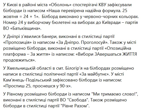«Речь идет как о сохранении агитационных материалов, которые не были своевременно изъяты, так и о появлении новых материалов с признаками агитационных. В частности, билбордов, размещенных без названий политических партий и их логотипов, однако полностью выполненных в стилистике политических партий (цвета, шрифты) и с использованием их предвыборных лозунгов», — сообщили в КИУ.