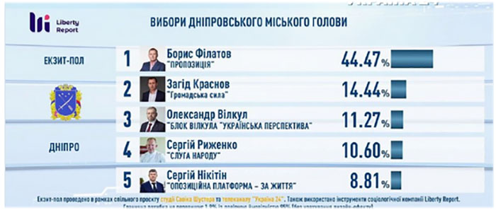 Во второй тур выборов в Одессе, по данным «Савик Шустер студия» и телеканала «Украина 24», выходит также представитель «Оппозиционной платформы-За жизнь» Николай Скорик, а в Днепре — лидер партии «Громадська сила» Загид Краснов.
