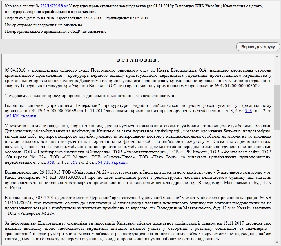 В тот же день суд предоставил правоохранителям доступ к документам по упомянутым выше объектам, которые находятся во владении Департамента по вопросам ГАСК КГГА и ГАСИ Украины. В частности, полицейским понадобились декларации о готовности объектов к эксплуатации, в которых указана информация об уплате паевых взносов по таким объектам. Вероятно, это связано с тем, что по части указанных выше объектов такие разрешительные документы выдавал Департамент по вопросам ГАСК КГГА, а по другой части - ГАСИ Украины.