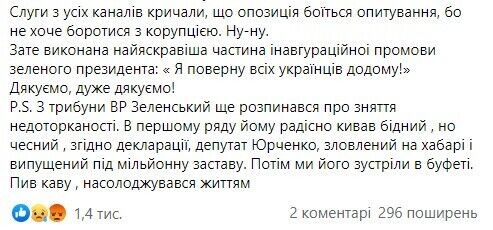 "С трибуны ВР Зеленский еще распинался о снятии неприкосновенности. В первом ряду ему радостно кивал бедный, но честный, согласно декларации, депутат Юрченко, пойманный на взятке и выпущен под миллионный залог. Затем мы его встретили в буфете. Пил кофе, наслаждался жизнью", – резюмировала Ирина Геращенко.
