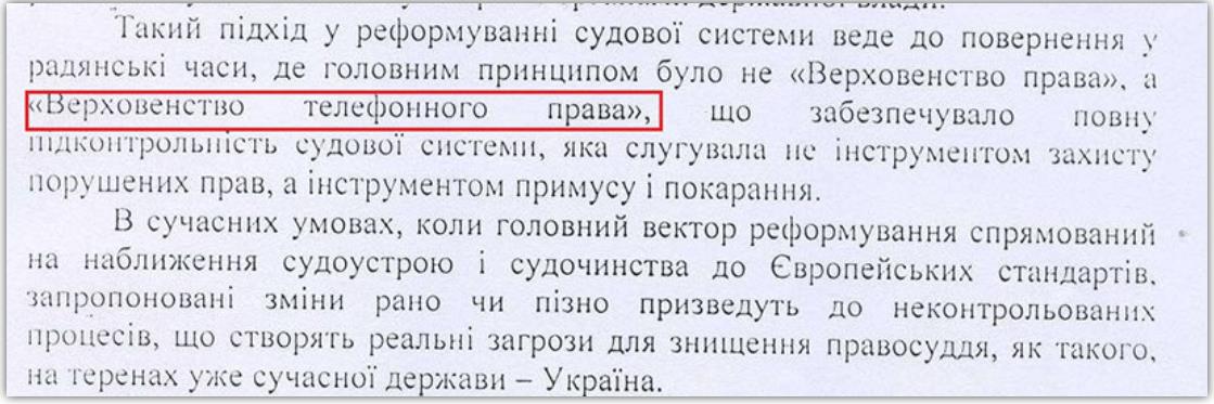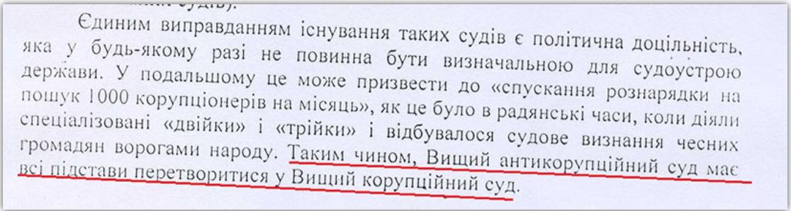 Варто згадати і те, що у 2016 році керівництво ВАСУ дуже критично сприйняли судову реформу, публічно та офіційно жорстко критикували створення нового Верховного Суду та Вищого антикорупційного суду. У листі ВАСУ від 09.06.16 р. № 1473/9-14/16 за підписом голови ВАСУ на ім’я президента вказано, що ця реформа призведе до повернення «Верховенства телефонного права» та знищення правосуддя, а Вищий антикорупційний суд перетвориться у Вищий корупційний суд.