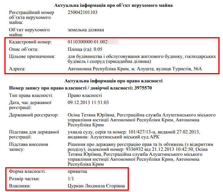 Ми повернемося знову до Криму, тому що там у родини задекларовано три ділянки та чималий будинок площею 305 кв. м в Алушті на вул. Туристів. Його немає в реєстрі і його набуто дружиною кандидата у судді КСУ на підставі дуже сумнівного судового рішення у справі, яка має всі ознаки штучного спору. Такі спори «розігрувались» для реєстрації права власності на нерухомість через суд в обхід від законних процедур. Так, 29 січня 2013 року Цуркан Людмила Єгорівна звернулась до Алуштинського суду з позовом до Карнаух Ганни Яківни про визнання права власності на спільно побудоване майно. А потім одразу ж подали заяву про затвердження мирової угоди про визнання права власності на землю та збудований будинок. Суд менше ніж за місяць розглянув справу та ухвалою від 27 лютого 2013 року в справі № 101/427/13- ц затвердив цю мирову угоду. Хоча судді Цуркану точно відомо, що суд не мав права визнавати право власності на будинок, який не був введений в експлуатацію та в обхід від законодавства про містобудування.