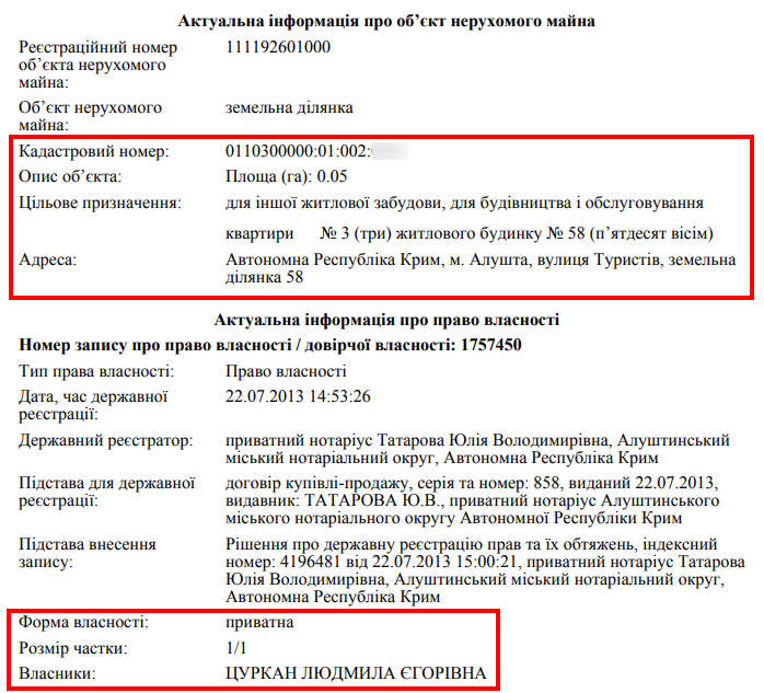 У декларації кандидата на посаду Цуркана за попередній рік є чотири земельні ділянки: одна під Києвом площею 0,16 га, придбана для садівництва, та три в Алушті, зареєстровані на дружину, набуті за рік до окупації Криму. Також впродовж року Михайло Іванович орендував ділянку в чверть гектара для будівництва в Чернівецькій області. Однак відомостей про це ми не знайшли в суддівських деклараціях за 2013 та 2014 роки. Більше того, кадастрова карта досі містить інформацію про оренду.