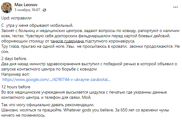 Так, Леонов написал, что ему "звонят из больниц и медицинских центров, задают вопросы по ковиду, рапортуют о наличии коек, тестах".