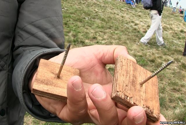 Один из участников восхождения сообщил Крым.Реалии, что на тропинках при подъеме по пути следования он обнаружил около 10-ти дощечек, в которые были вкручены саморезы с заточенными концами. «Для чего это сделано, неизвестно», – отметил он. Другие участники акции предположили, что это дело рук недоброжелателей.