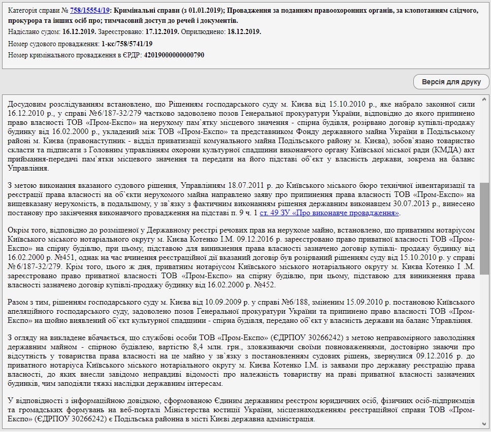 Этим решением ГПУ было отказано в отмене государственной регистрации за ООО “Пром-Экспо” права частной собственности на здание-памятник архитектуры по ул. Волошской/Борисоглебской/Набережно-Крещатицкой, 2/21/19 (лит. Б). Эту регистрацию 9 февраля 2016 года осуществила частный нотариус Киевского городского нотариального округа города Киева Ирина Котенко. Кроме того, Хозсуд Киева отказал ООО “Пром-Экспо” в признании права собственности на этот объект, который она купила у столичных властей в 2000 году и по возвращению которого в коммунальную или государственную собственность уже не первый год идут суды.